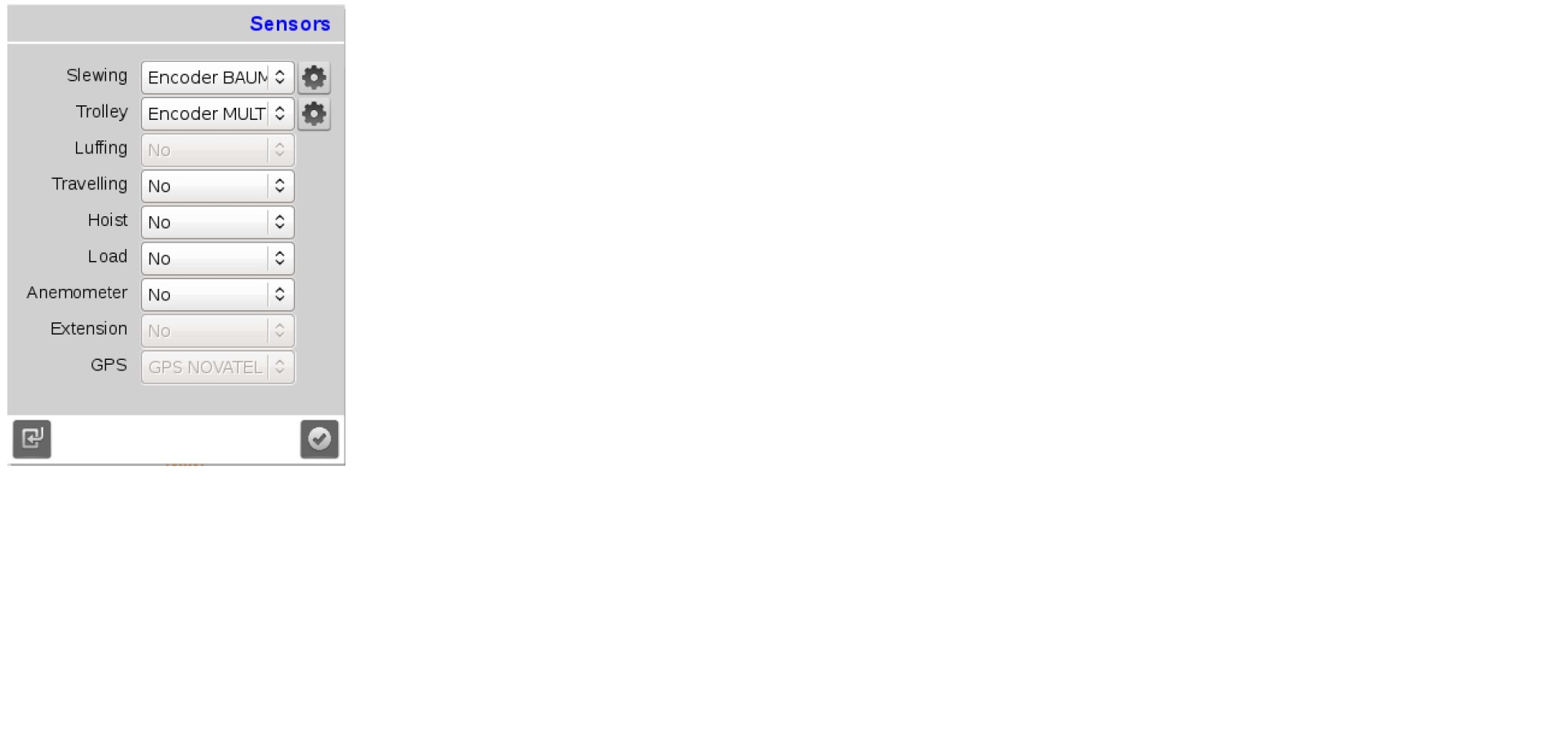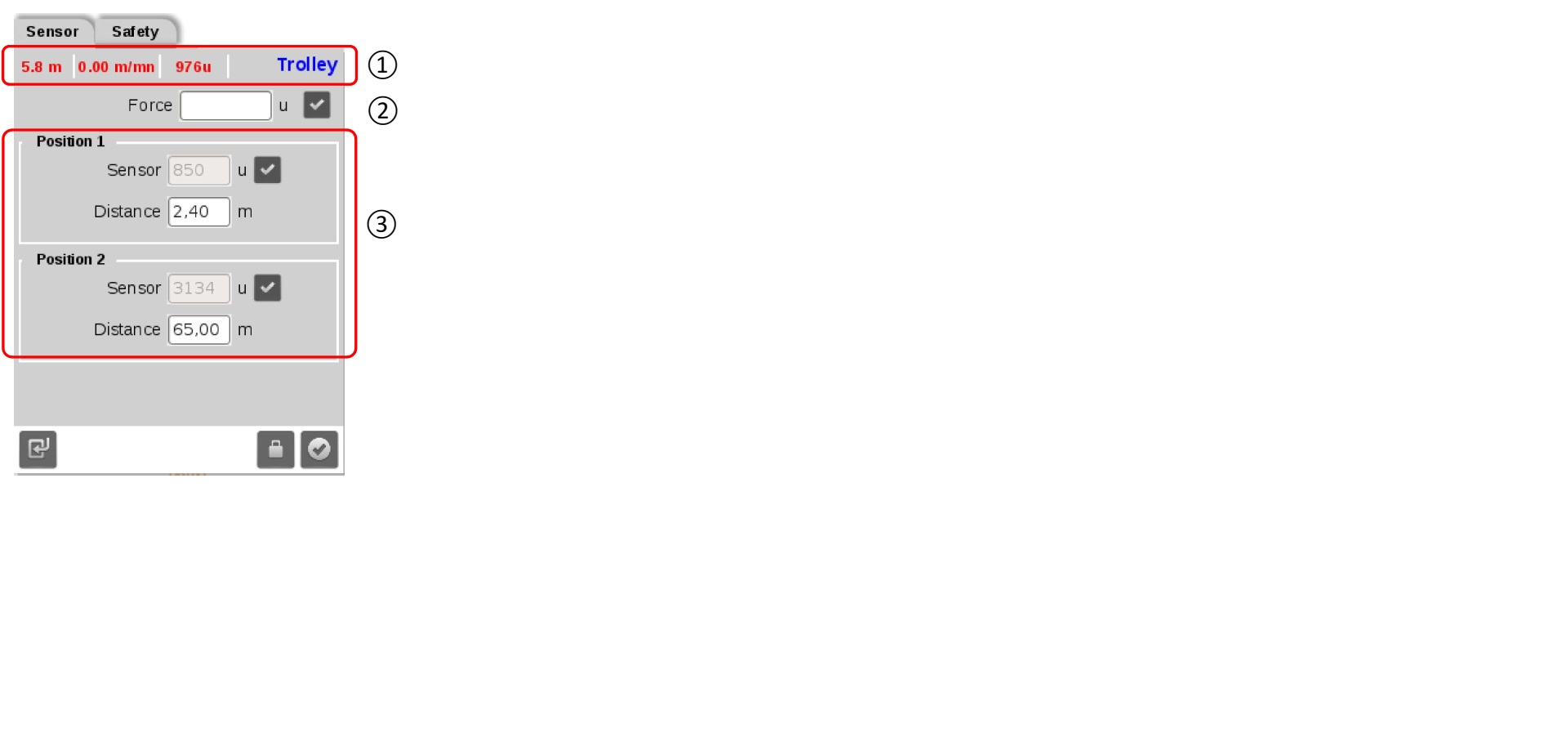 Although you can set position 1 or 2 first, start with position 2 (the outer limit), so you can trolley back in and set the inner limit (position 1). Once you position the trolley at the outer limit, verify the distance and sensor value and click the checkmark box. Repeat for position 1 at the inner trolley limit