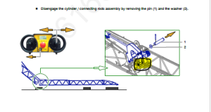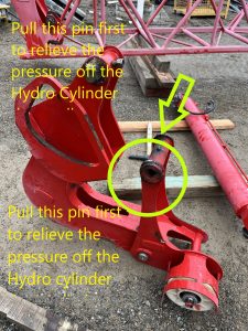 With the pictures above the picture from the manual tells you to pull this pin to get the cylinder off. Which there is to much pressure on the cylinder to get that pin out with out possibly bending the Jib on the crane. When you get to this step of taking the Hydraulic Cylinder off you will want to revert to the edited picture above and pull that pin first.