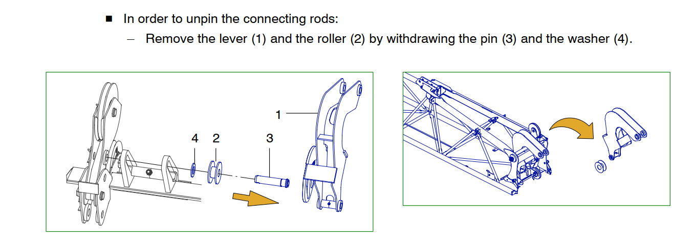 The operator manual disassembly instructions do not match the actual process to remove the outer jib. When removing the outer connecting rod/hydraulic assembly, there is no need to remove the pulley pin and roller assembly as detailed in this step.
