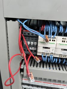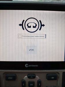 Operator complains crane will not start and the display shows Three phase power supply missing. Check for incoming power and all 3 phases. If power is correct on each of the three legs (277 VAC), check contactor K102M. A1 terminal should be receiving 277VAC on the A1 terminal. If that is correct, coil in contactor may be bad. Remove wire from terminal 22, hold in contactor and start the crane. If crane starts and runs, the contactor coil has failed.